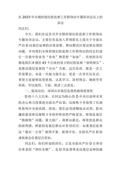 【七哥公文】2025年:在2025年全镇村级纪检监察工作联络站专题培训会议上的讲话+更多免费公文+VX:QiGeGongWen2024