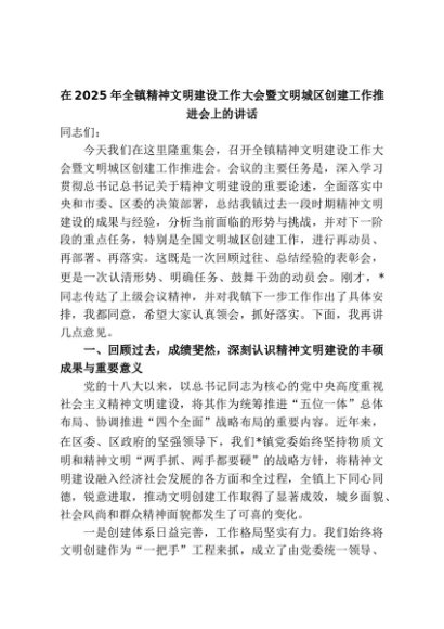 【七哥公文】2025年:在2025年全镇精神文明建设工作大会暨文明城区创建工作推进会上的讲话+更多免费公文+VX:QiGeGongWen2024