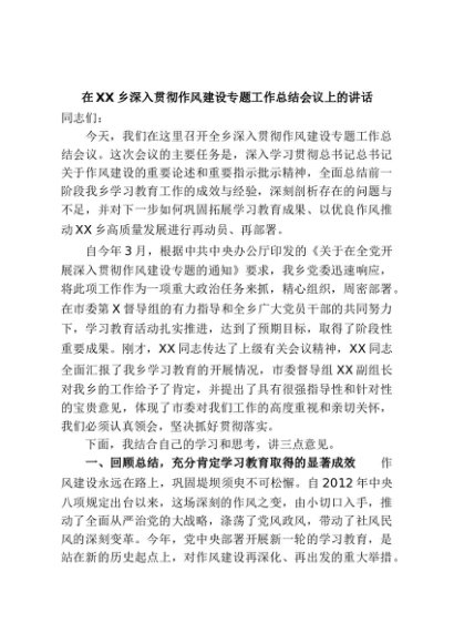 / 【七哥公文】2025年:在XX乡深入贯彻作风建设专题工作总结会议上的讲话+更多免费公文+VX:QiGeGongWen2024