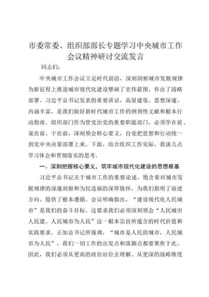 【七哥公文】2025年:市委常委、组织部部长专题学习中央城市工作会议精神研讨交流发言+更多免费公文+VX:QiGeGongWen2024