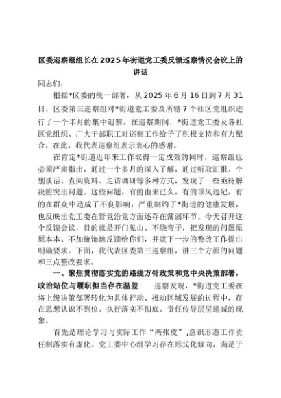 【七哥公文】2025年:区委巡察组组长在2025年街道党工委反馈巡察情况会议上的讲话+更多免费公文+VX:QiGeGongWen2024