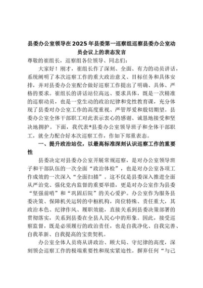 【七哥公文】2025年:县委办公室领导在2025年县委第一巡察组巡察县委办公室动员会议上的表态发言+更多免费公文+VX:QiGeGongWen2024