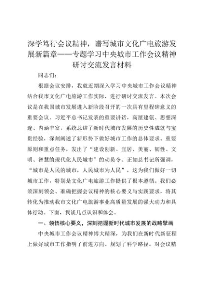 【七哥公文】2025年:深学笃行会议精神,谱写城市文化广电旅游发展新篇章——专题学习中央城市工作会议精神研讨交流发言材料+更多免费公文+VX:QiGeGongWen2024