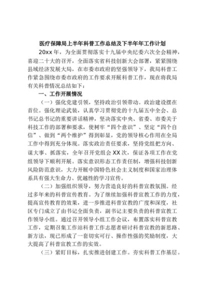 【七哥公文】2025年:医疗保障局上半年科普工作总结及下半年年工作计划+更多免费公文+VX:QiGeGongWen2024
