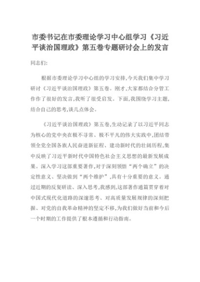 【七哥公文】2025年:市委书记在市委理论学习中心组学习《习近平谈治国理政》第五卷专题研讨会上的发言+更多免费公文+VX:QiGeGongWen2024