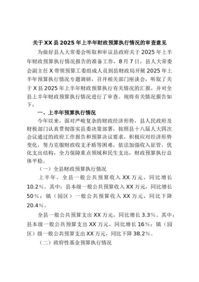 【七哥公文】2025年:关于XX县2025年上半年财政预算执行情况的审查意见+更多免费公文+VX:QiGeGongWen2024