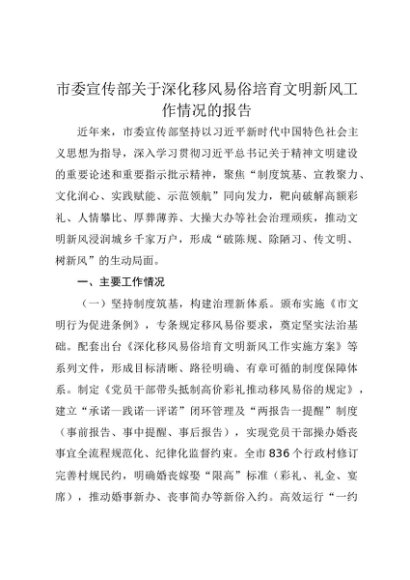 【七哥公文】2025年:市委宣传部关于深化移风易俗培育文明新风工作情况的报告+更多免费公文+VX:QiGeGongWen2024
