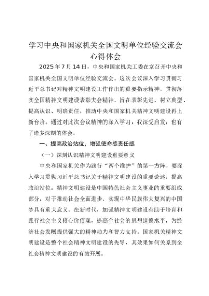 【七哥公文】2025年:学习中央和国家机关全国文明单位经验交流会心得体会+更多免费公文+VX:QiGeGongWen2024