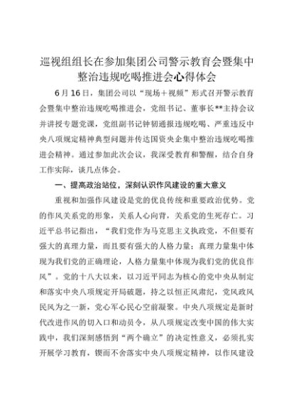 【七哥公文】2025年:巡视组组长在参加集团公司警示教育会暨集中整治违规吃喝推进会心得体会+更多免费公文+VX:QiGeGongWen2024