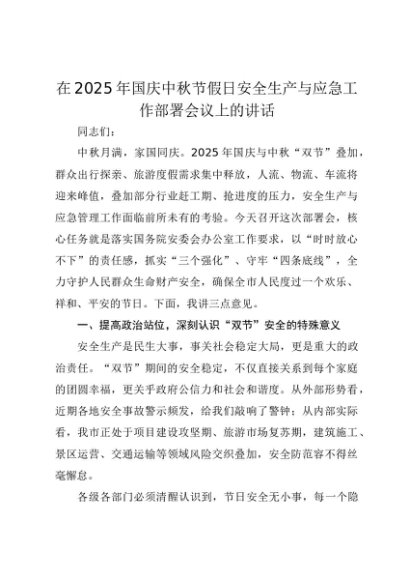 【七哥公文】2025年:在2025年国庆中秋节假日安全生产与应急工作部署会议上的讲话+更多免费公文+VX:QiGeGongWen2024