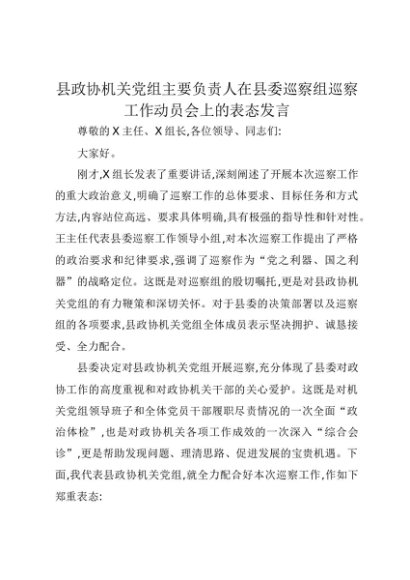 【七哥公文】2025年:县政协机关党组主要负责人在县委巡察组巡察工作动员会上的表态发言+更多免费公文+VX:QiGeGongWen2024