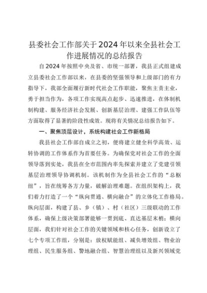 【七哥公文】2025年:县委社会工作部关于2024年以来全县社会工作进展情况的总结报告+更多免费公文+VX:QiGeGongWen2024