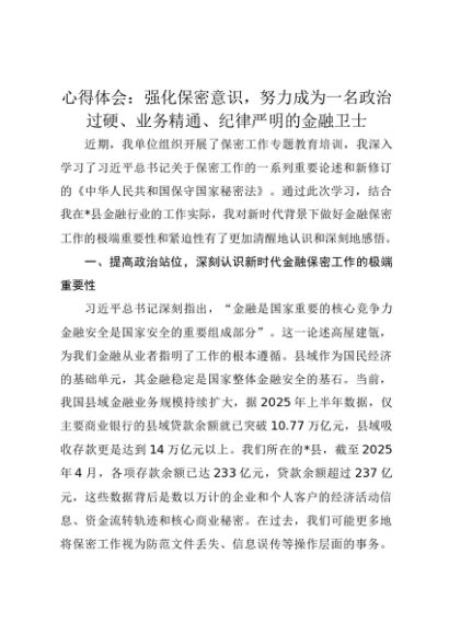 【七哥公文】2025年:心得体会:强化保密意识,努力成为一名政治过硬、业务精通、纪律严明的金融卫士+更多免费公文+VX:QiGeGongWen2024