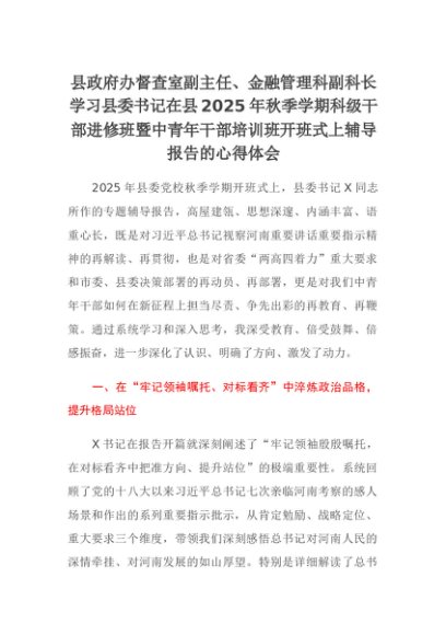 【七哥公文】2025年:县政府办督查室副主任、金融管理科副科长学习县委书记在县2025年秋季学期科级干部进修班暨中青年干部培训班开班式上辅导报告的心得体会+更多免费公文+VX:QiGeGongWen2024