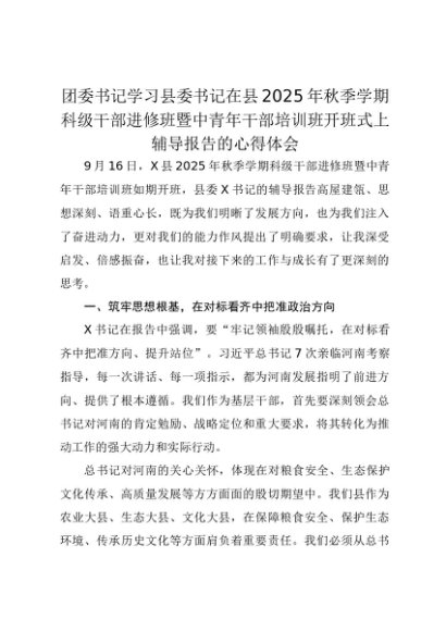 【七哥公文】2025年:团委书记学习县委书记在县2025年秋季学期科级干部进修班暨中青年干部培训班开班式上辅导报告的心得体会+更多免费公文+VX:QiGeGongWen2024