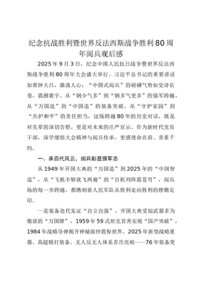 【七哥公文】2025年:纪念抗战胜利暨世界反法西斯战争胜利80周年阅兵观后感心得体会+更多免费公文+VX:QiGeGongWen2024