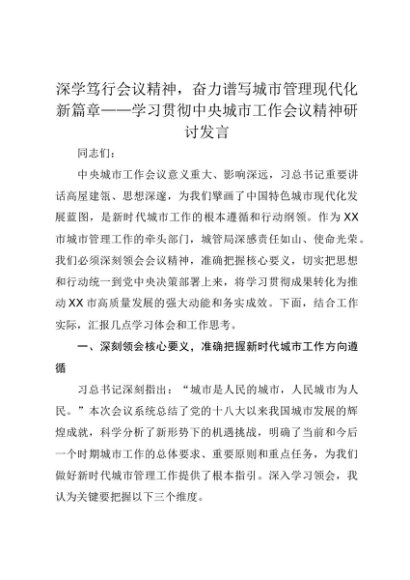 【七哥公文】2025年:深学笃行会议精神,奋力谱写城市管理现代化新篇章——学习贯彻中央城市工作会议精神研讨发言+更多免费公文+VX:QiGeGongWen2024