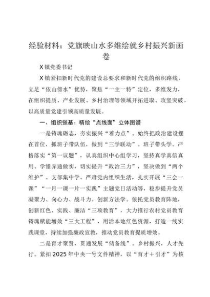 / 【七哥公文】2025年:经验材料:党旗映山水多维绘就乡村振兴新画卷+更多免费公文+VX:QiGeGongWen2024