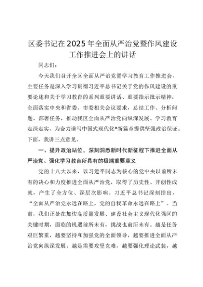 【七哥公文】2025年:区委书记在2025年全面从严治党暨作风建设工作推进会上的讲话+更多免费公文+VX:QiGeGongWen2024