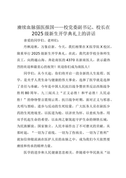 【七哥公文】2025年:赓续血脉强医报国——校党委副书记、校长在2025级新生开学典礼上的讲话+更多免费公文+VX:QiGeGongWen2024