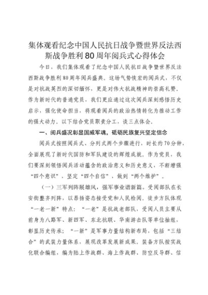 【七哥公文】2025年:集体观看纪念中国人民抗日战争暨世界反法西斯战争胜利80周年阅兵式心得体会+更多免费公文+VX:QiGeGongWen2024