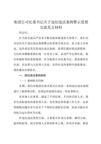 【七哥公文】2025年:集团公司纪委书记关于违纪违法案例警示思想交流发言材料+更多免费公文+VX:QiGeGongWen2024