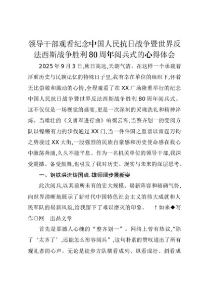 【七哥公文】2025年:领导干部观看纪念中国人民抗日战争暨世界反法西斯战争胜利80周年阅兵式的心得体会+更多免费公文+VX:QiGeGongWen2024