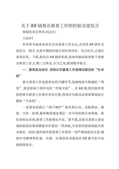 【七哥公文】2025年:关于XX镇督办督查工作的经验交流发言+更多免费公文+VX:QiGeGongWen2024