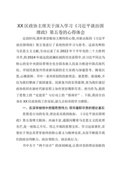 【七哥公文】2025年:XX区政协主席关于深入学习《习近平谈治国理政》第五卷的心得体会+更多免费公文+VX:QiGeGongWen2024