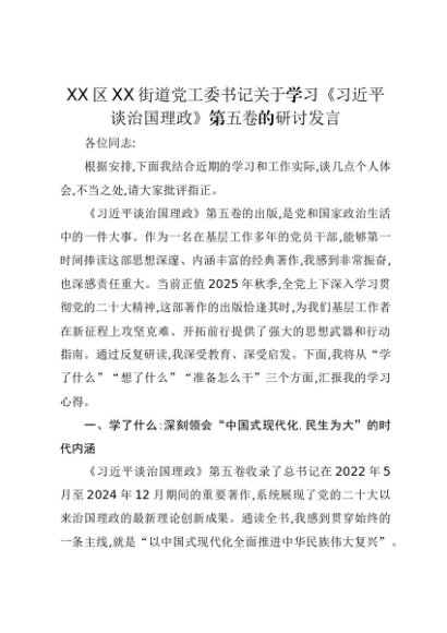 【七哥公文】2025年:XX区XX街道党工委书记关于学习《习近平谈治国理政》第五卷的研讨发言+更多免费公文+VX:QiGeGongWen2024