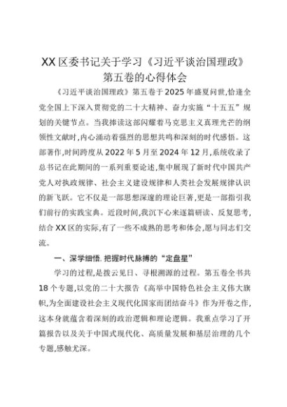 【七哥公文】2025年:XX区委书记关于学习《习近平谈治国理政》第五卷的心得体会+更多免费公文+VX:QiGeGongWen2024