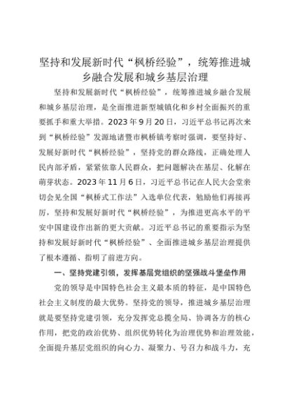 【七哥公文】2025年:党课讲稿:坚持和发展新时代“枫桥经验”,统筹推进城乡融合发展和城乡基层治理+更多免费公文+VX:QiGeGongWen2024
