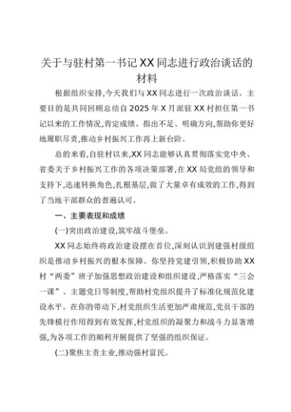 / 【七哥公文】2025年:关于与驻村第一书记XX同志进行政治谈话的材料+更多免费公文+VX:QiGeGongWen2024