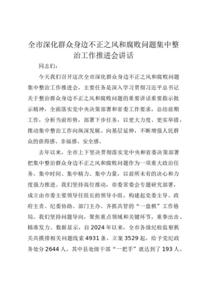 【七哥公文】2025年:全市深化群众身边不正之风和腐败问题集中整治工作推进会讲话+更多免费公文+VX:QiGeGongWen2024
