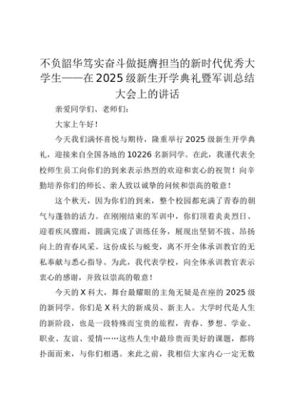 【七哥公文】2025年:不负韶华笃实奋斗做挺膺担当的新时代优秀大学生——在2025级新生开学典礼暨军训总结大会上的讲话+更多免费公文+VX:QiGeGongWen2024