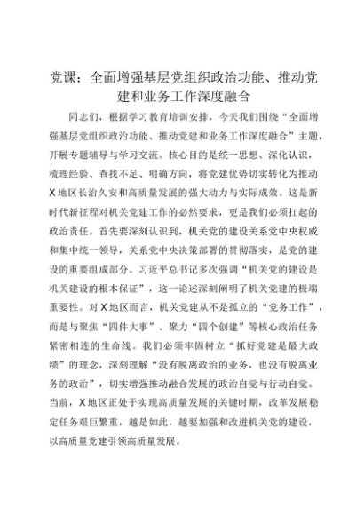 【七哥公文】2025年:党课讲稿:全面增强基层党组织政治功能、推动党建和业务工作深度融合+更多免费公文+VX:QiGeGongWen2024