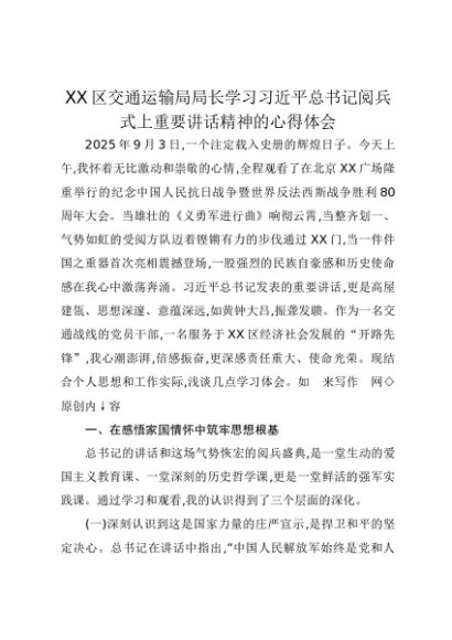 【七哥公文】2025年:XX区交通运输局局长学习习近平总书记阅兵式上重要讲话精神的心得体会+更多免费公文+VX:QiGeGongWen2024