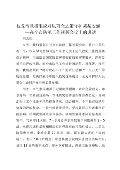 【七哥公文】2025年:枕戈待旦极限应对以万全之策守护某某安澜——在全市防汛工作视频会议上的讲话+更多免费公文+VX:QiGeGongWen2024