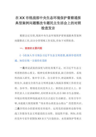【七哥公文】2025年:在XX市统战部中央生态环境保护督察通报典型案例问题整改专题民主生活会上的对照检查发言+更多免费公文+VX:QiGeGongWen2024
