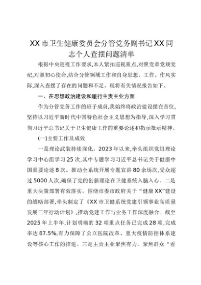 【七哥公文】2025年:XX市卫生健康委员会分管党务副书记XX同志个人查摆问题清单+更多免费公文+VX:QiGeGongWen2024