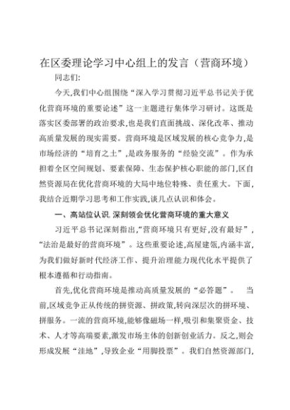 / 【七哥公文】2025年:在区委理论学习中心组上的发言(营商环境)+更多免费公文+VX:QiGeGongWen2024