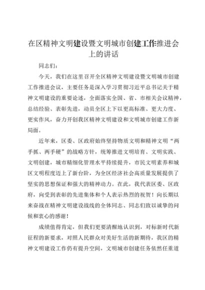 【七哥公文】2025年:在区精神文明建设暨文明城市创建工作推进会上的讲话+更多免费公文+VX:QiGeGongWen2024