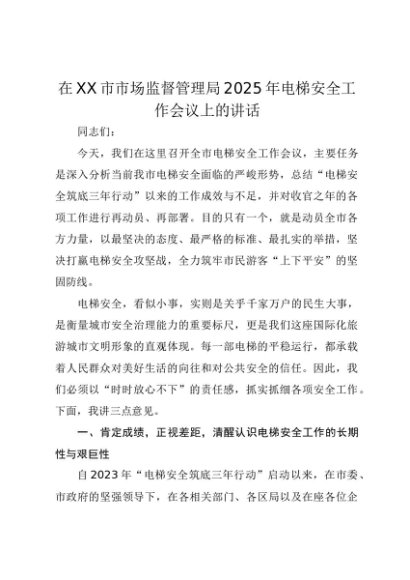 【七哥公文】2025年:在XX市市场监督管理局2025年电梯安全工作会议上的讲话+更多免费公文+VX:QiGeGongWen2024