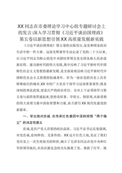 【七哥公文】2025年:XX同志在市委理论学习中心组专题研讨会上的发言深入学习贯彻《习近平谈治国理政》第五卷以新思想引领XX高质量发展新实践+更多免费公文+VX:QiGeGongWen2024