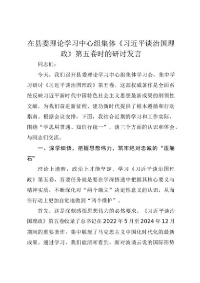 【七哥公文】2025年:在县委理论学习中心组集体《习近平谈治国理政》第五卷时的研讨发言+更多免费公文+VX:QiGeGongWen2024