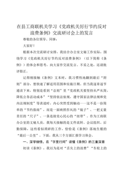 【七哥公文】2025年:在县工商联机关学习《党政机关厉行节约反对浪费条例》交流研讨会上的发言+更多免费公文+VX:QiGeGongWen2024