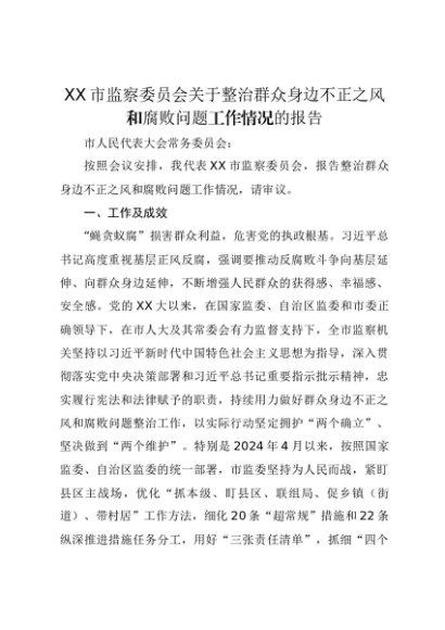 【七哥公文】2025年:XX市监察委员会关于整治群众身边不正之风和腐败问题工作情况的报告+更多免费公文+VX:QiGeGongWen2024