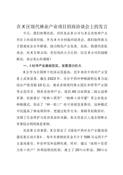 / 【七哥公文】2025年:在X区现代林业产业项目招商洽谈会上的发言+更多免费公文+VX:QiGeGongWen2024