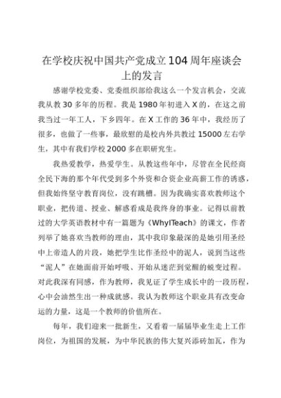 【七哥公文】2025年:在学校庆祝中国共产党成立104周年座谈会上的发言+更多免费公文+VX:QiGeGongWen2024