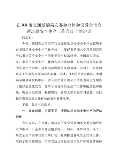 【七哥公文】2025年:在XX市交通运输局安委会全体会议暨全市交通运输安全生产工作会议上的讲话+更多免费公文+VX:QiGeGongWen2024